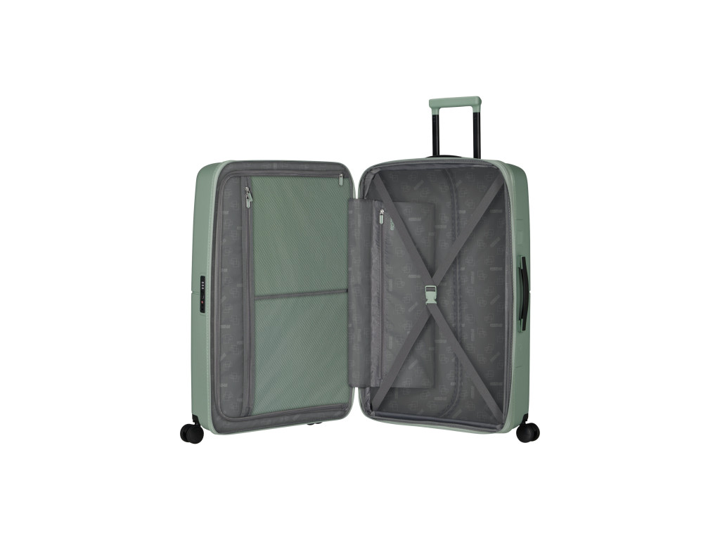Každý kufor je dodávaný s dvoma archami nálepiek, pomocou ktorých môžete dodať vášmu kufru osobný nádych. Slúži ku tomu bočný panel. Podšívka je vyrobená z 13 recyklovaných PET fliaš pomocou technológie Recyclex™. Odolná konštrukcia - zmes lesklej, pieskovanej a čiarkovanej textúry vytvára peknú hru svetla a zároveň zvyšuje odolnosť. Dobre organizovaný interiér - jednoduché uloženie a oddelenie vecí vďaka elastickým prekríženým popruhom v spodnej časti a podšívkovej priehradke so sieťovaným vreckom na zips, vo vrchnej časti.