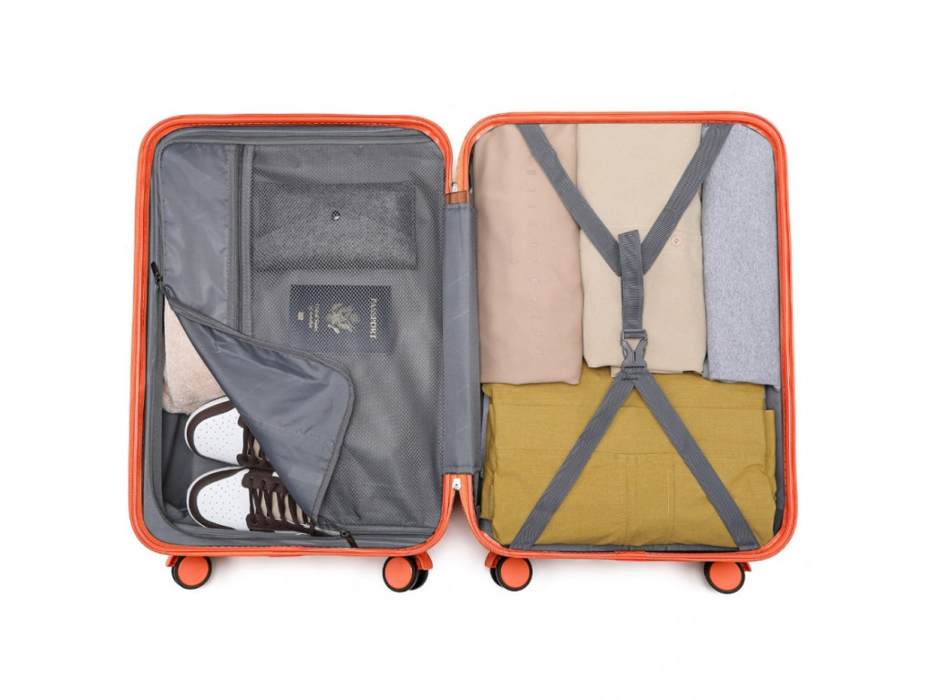- Pružné krížové popruhy pre upevnenie obsahu na jednej strane. Zipsom uzatvárateľná priehradka na druhej strane kufra, vrátane sieťovaného vrecka pre lepšiu organizáciu v kufri.