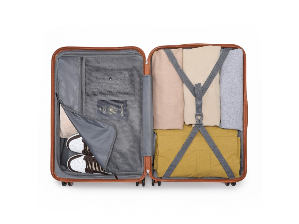 - Pružné krížové popruhy pre upevnenie obsahu na jednej strane a zipsom uzatváraná priehradka na druhej strane kufra