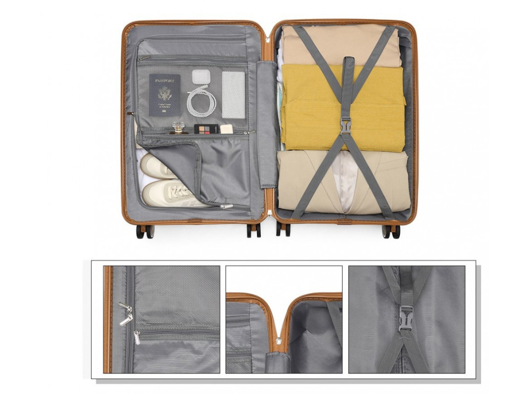 - Nylónové krížové popruhy pre upevnenie obsahu na jednej strane. Zipsom uzatvárateľná priehradka na druhej strane kufra, vrátane dvoch sieťovaných vreciek pre lepšiu organizáciu v kufri