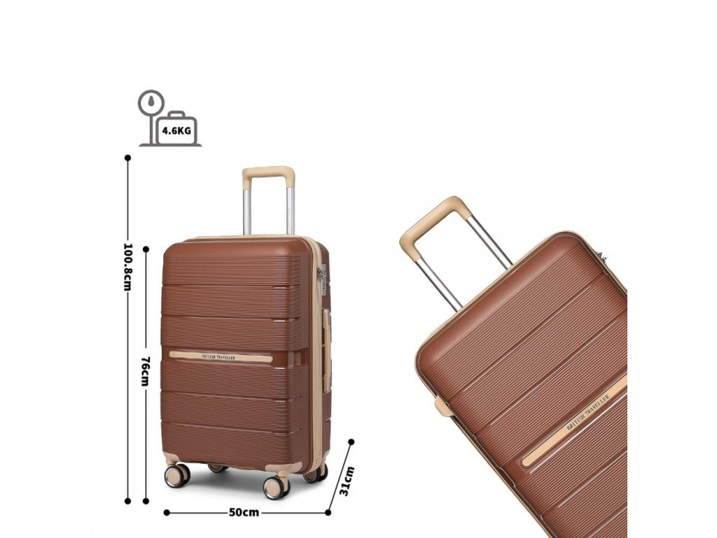 Kufor značky BRITISH TRAVELLER. Ide o novú značku v našom sortimente, ktorá sa zameriava na výrobu batožiny z prémiových materiálov. Okrem kvalitného polypropylénu ponúka designovo zladené detaily na kufri ako zipsy, kolieska a madlá vo farbe lemovania, prípadne vo farbe kufra. Práve na týchto detailoch je rozoznateľná kvalita vypracovania batožiny.