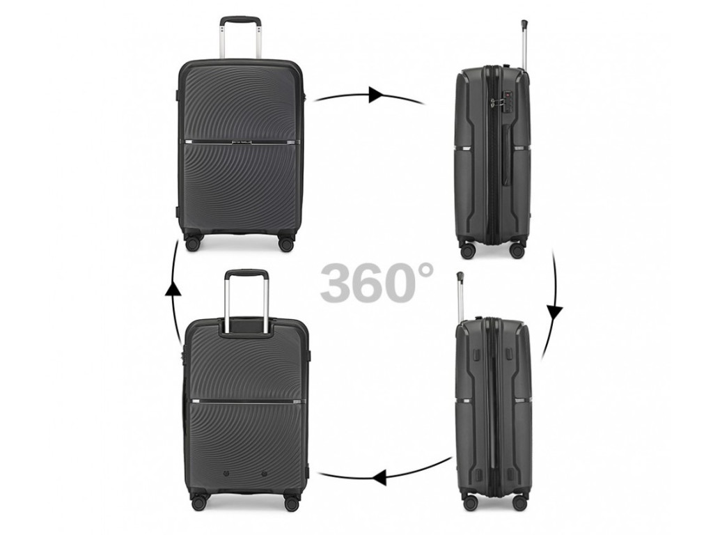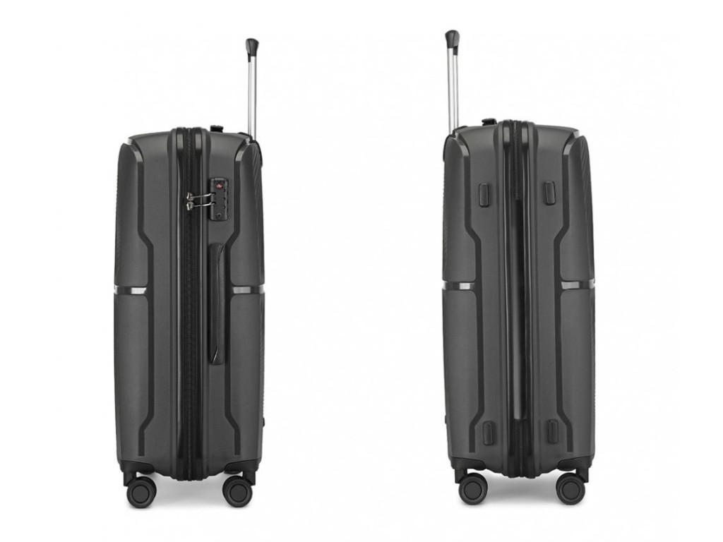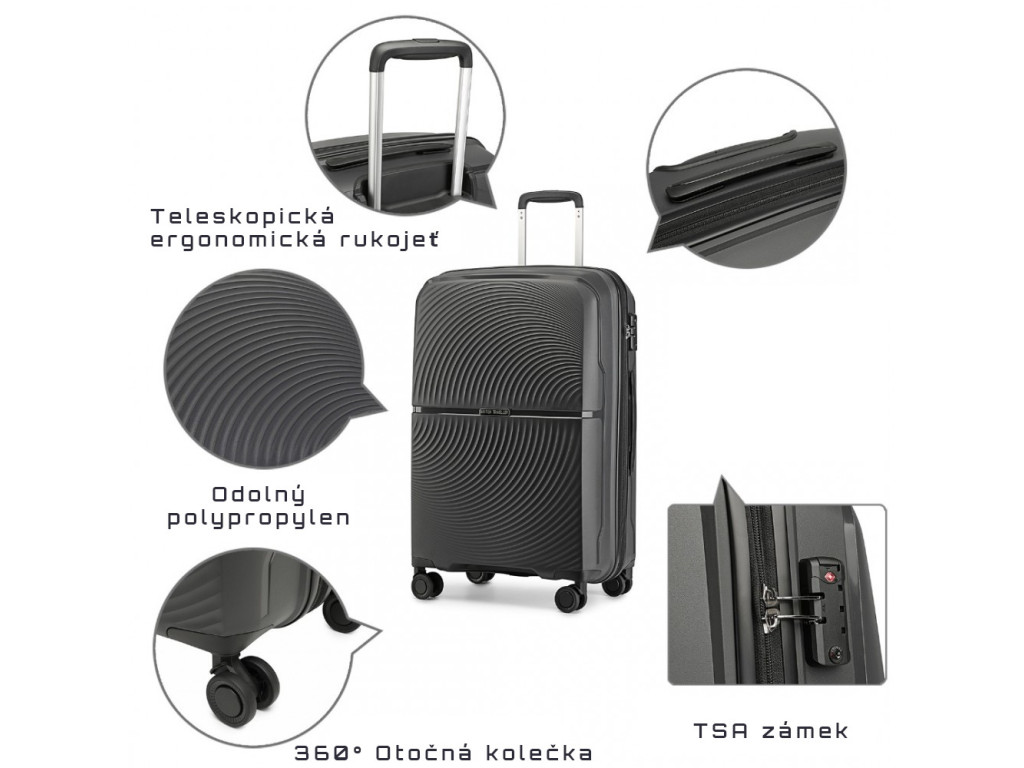 Kufor je vyrobený z kvalitného polypropylénu s tichými dvojitými kolieskami, hliníkovou výsuvnou rukoväťou, TSA číselným zámkom a kvalitnými zipsami. Madlo kufra je na hornej aj bočnej strane.