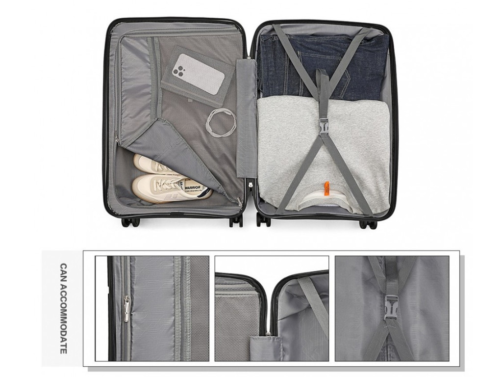 - Nylónové krížové popruhy pre upevnenie obsahu na jednej strane. Zipsom uzatvárateľná priehradka na druhej strane kufra, vrátane dvoch sieťovaných vreciek pre lepšiu organizáciu v kufri.