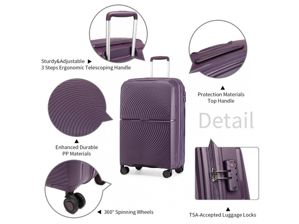 Kufor je vyrobený z kvalitného polypropylénu s tichými dvojitými kolieskami, hliníkovou výsuvnou rukoväťou, TSA číselným zámkom a kvalitnými zipsami. Madlo kufra na hornej aj bočnej strane. Najmä u kabínového kufra väčšina výrobcov madlo na pozdĺžnej strane nenabízajú.