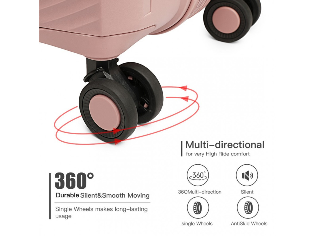 Kufor je vyrobený z kvalitného polypropylénu s tichými dvojitými kolieskami, hliníkovou výsuvnou rukoväťou, TSA číselným zámkom a kvalitnými zipsami. Madlo kufra na hornej aj bočnej strane. Najmä u kabínového kufra väčšina výrobcov madlo na pozdĺžnej strane nenabízajú.