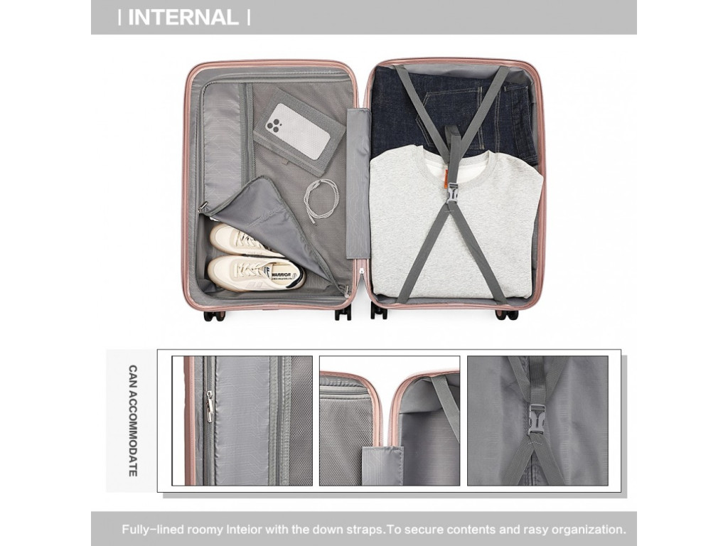 - Nylonové krížové popruhy pre upevnenie obsahu na jednej strane. Zipsom uzatváraná priehradka na druhej strane kufra vrátane dvoch sieťovaných vreciek pre lepšiu organizáciu v kufri.