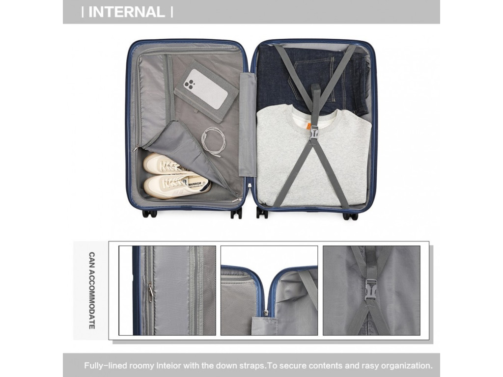 - Nylónové krížové popruhy pre upevnenie obsahu na jednej strane. Zipsom uzatvárateľná priehradka na druhej strane kufra, vrátane dvoch sieťovaných vreciek pre lepšiu organizáciu v kufri.