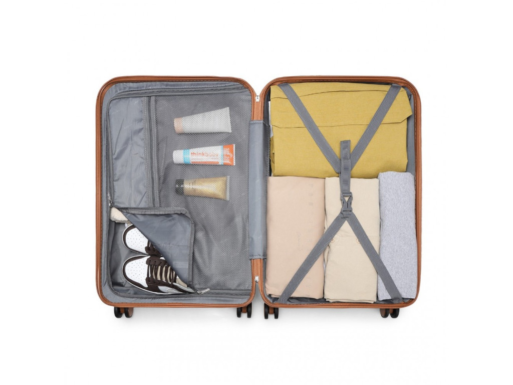 - Nylonové krížové popruhy pre upevnenie obsahu na jednej strane a zipsom uzatváraná priehradka na druhej strane kufra
