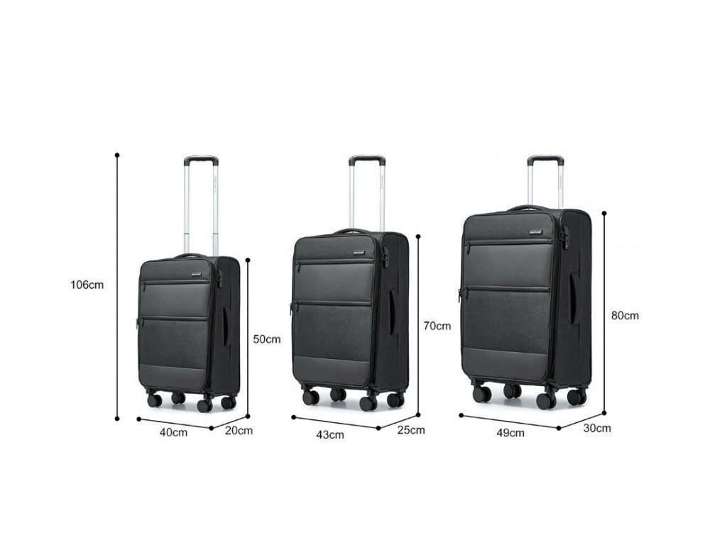 Sada obsahuje 3 kufre s rozmermi veľkosti S, M a L na cestovanie s rôznymi potrebami a dĺžkami pobytu. Kabínový S kufor na víkendové alebo ľahšie týždenné cesty. Stredný M kufor na týždenné cesty a L kufor aj na dvojtýždňové dovolenky.