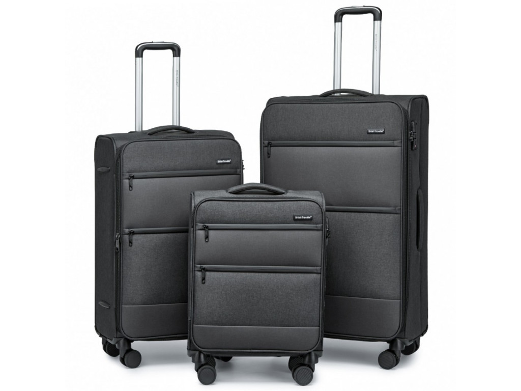 Sada látkových kufrov značky BRITISH TRAVELLER. Ide o novú značku v našom sortimente, ktorá sa zameriava na výrobu batožiny z prémiových materiálov. Okrem kvalitného polypropylénu ponúka designovo zladené detaily na kufri ako zipsy, kolieska a madlá vo farbe lemovania, prípadne vo farbe kufra. Práve na týchto detailoch je rozoznateľná kvalita vypracovania batožiny.