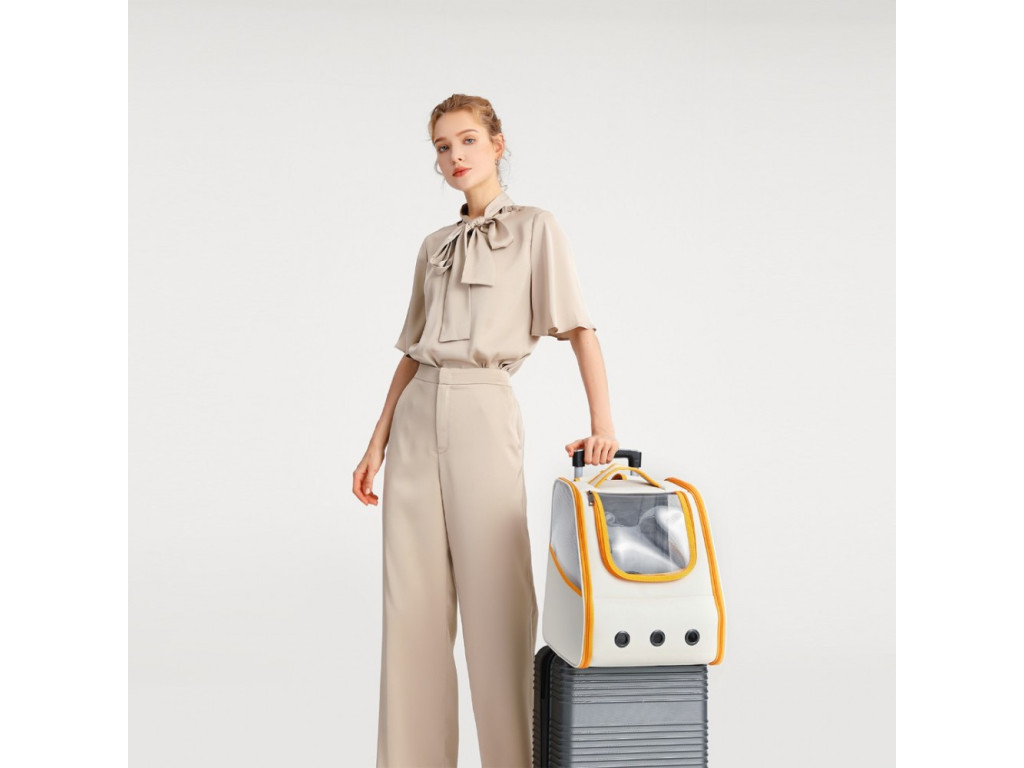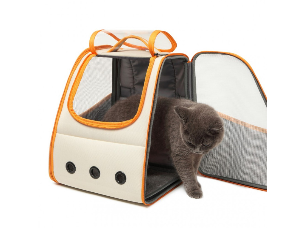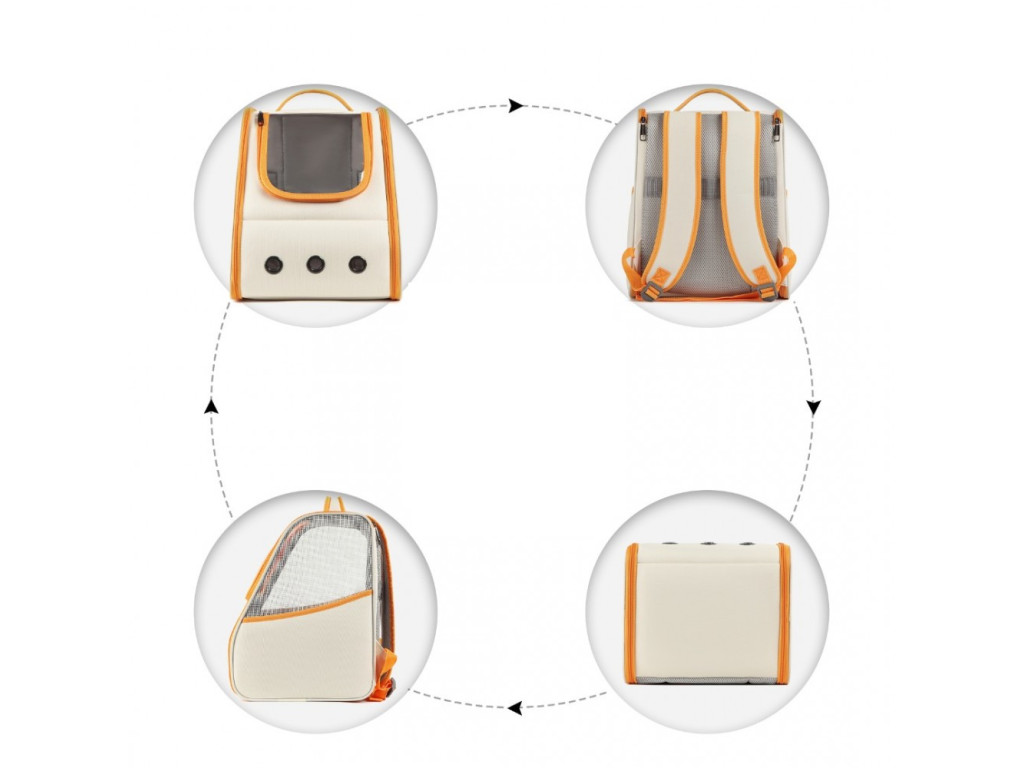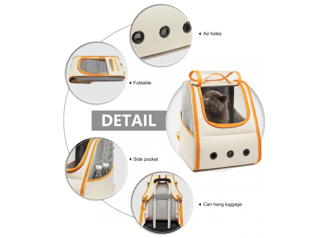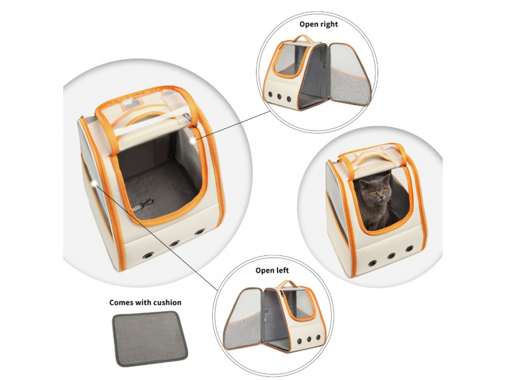 Ruksak vám pomôže pri prenášaní domácich maznáčikov bez potreby použitia rúk, v ktorých môžete niesť iné potrebné veci. Pre bezpečnejšie a pohodlnejšie cestovanie so zvieratkom. Skvelý aj na prepravu autom. Dobrý ventilačný systém pomôže zaistiť komfort zvierat a odvod pachu, na obidvoch stranách ruksaku sú ventilačné siete so zipsami a tri ventilačné otvory na prednej strane.Bočné vrecká určené na vreckovky, odpadkové sáčky, či dobrotky, vrchná časť zvieracieho útočiska má design s okienkom, ktoré umožňuje pozorovať, ako sa maznáčikovi páči cesta. Ruksak tiež obsahuje plyšový vankúš. Ramenné popruhy, horné madlo a zadná časť ruksaku majú dostatočné polstrovanie, aby znížili tlak na ramená. Na zadnej strane ruksaku je pás na pripevnenie na výsuvnú rukoväť kufra, či inej batožiny. Ruksak je zložiteľný v čase, keď ho nepotrebujete a v zloženom stave má hrúbku len 5 cm, čo podstatne šetrí miesto.