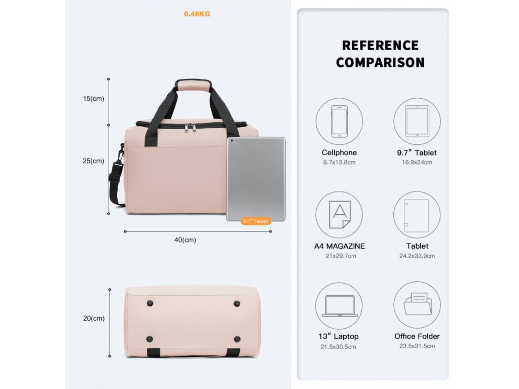 Taška je vybavená pásom umožňujúcim upevnenie ku rukoväti kufra a tak uľahčuje cestovanie. Taška spĺňa rozmermi normy spoločnosti Ryanair ako malá príručná batožina.