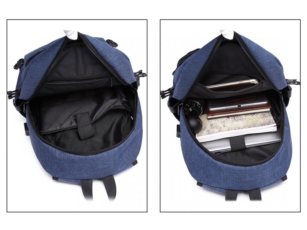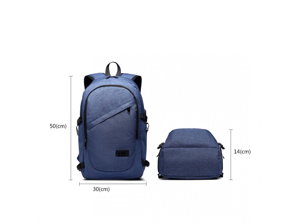 Je rozdelený na 2 komory, ktoré sú uzatvárateľné zipsami. V hlavnej komore nájdete polstrovaný priehradku na notebook a oddiel na tablet, USB prestup na prepojenie počas nabíjania (power banka nie je súčasťou) a zips je navyše uzamykateľný priloženým číslovým zámkom. Na prednej časti je vonkajšie zazipsovateľné vrecko. Z bokov sú dve ďalšie vrecká s magnetickým zapínaním.
