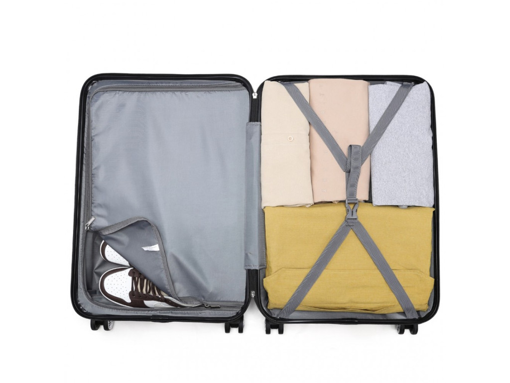 - Nylonové krížové popruhy pre upevnenie obsahu na jednej strane a zipsom uzatváraná priehradka na druhej strane kufra