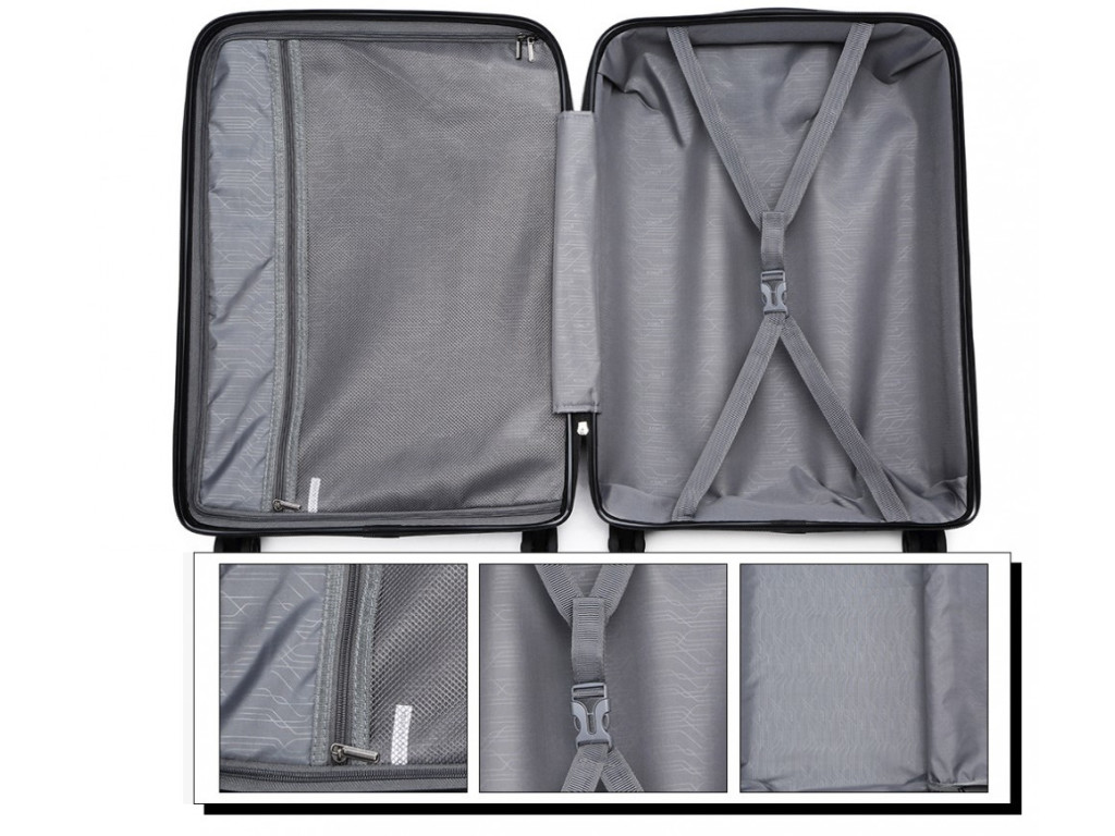 - Nylonové krížové popruhy pre upevnenie obsahu na jednej strane a zipsom uzatvoriteľná priehradka na druhej strane kufra