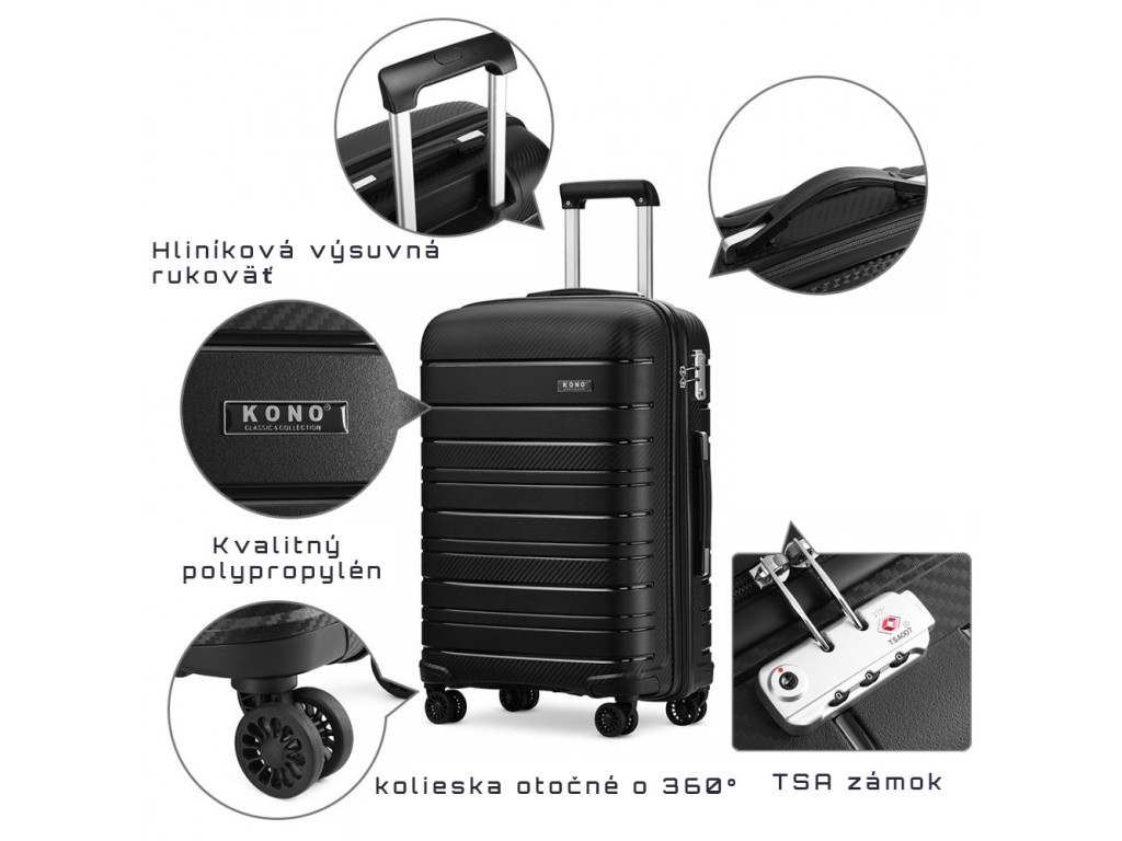 Sada 3 kufrov značky KONO, ktorá ponúka kvalitnú batožinu za dostupné ceny. Táto značka je veľmi známá v Západnej Európe pre optimálnu kombináciu ceny a výkonu. Od svojho vzniku sa zameriava na segment strednej triedy. V sortimente tak nenájdeme najlacnejšie kufre, ale len modely s kvalitnými komponentami (zámky, kolieska alebo škrupiny). Túto značku sme zaradili do nášho sortimentu práve s ohľadom na kvalitné spracovanie.