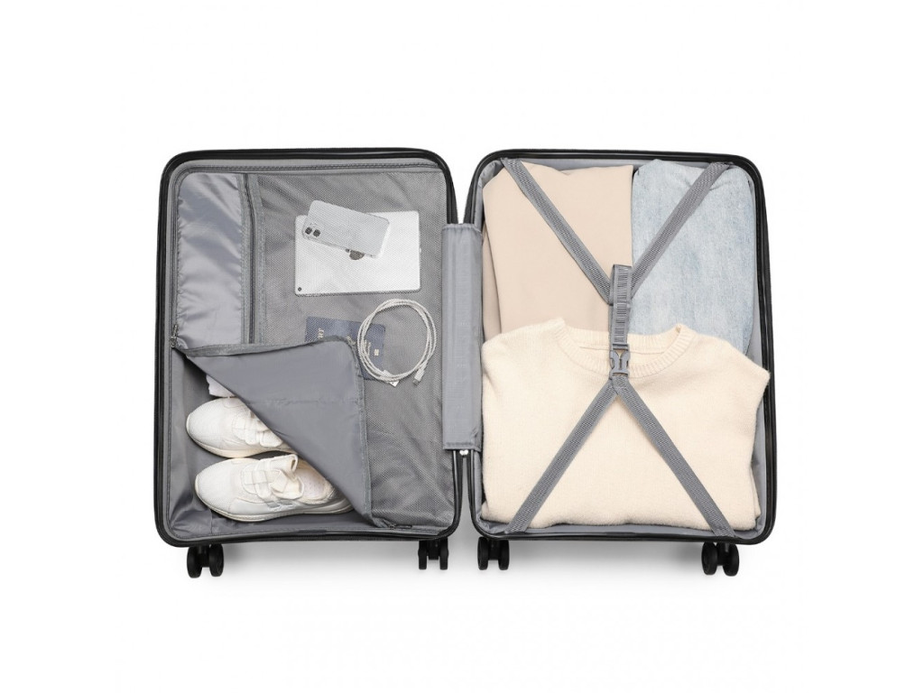 - Nylonové krížové popruhy pre upevnenie obsahu na jednej strane a zipsom uzatvoriteľná priehradka na druhej strane kufra