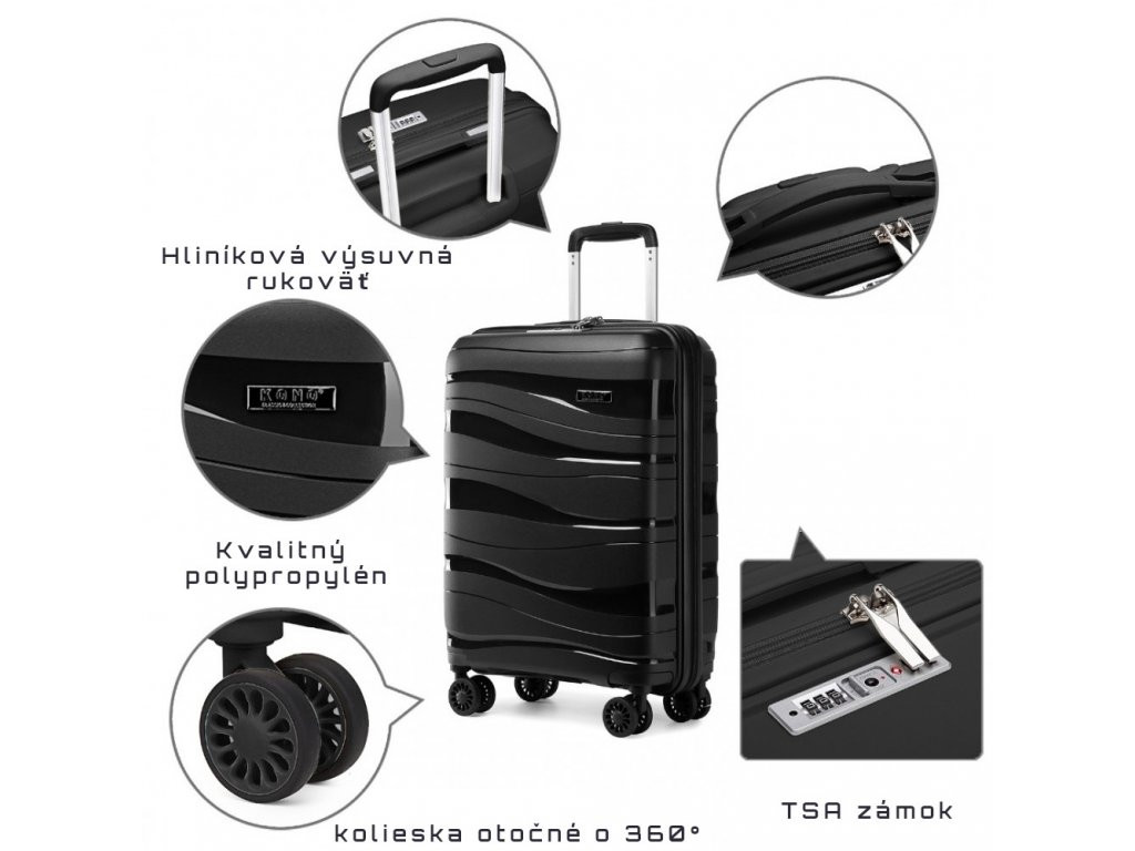 Vyrobené z kvalitného polypropylénu s tichými dvojitými kolieskami, hliníkovou výsuvnou rukoväťou/S,M a L a TSA číselným zámkom. Medzi hlavnými výhodami polypropylénu je výborná použiteľnosť pri cestovaní lietadlom. Polypropylén je odolný proti prasknutiu a pri nárazoch sa vráti do pôvodného tvaru. Naproti tomu kufre vyrobené z ABS sú náchylné na praskanie pri mechanickom pôsobení síl.