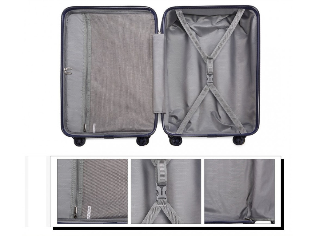 - Nylonové krížové popruhy na upevnenie obsahu na jednej strane a zipsom uzatvárateľná priehradka na druhej strane kufra