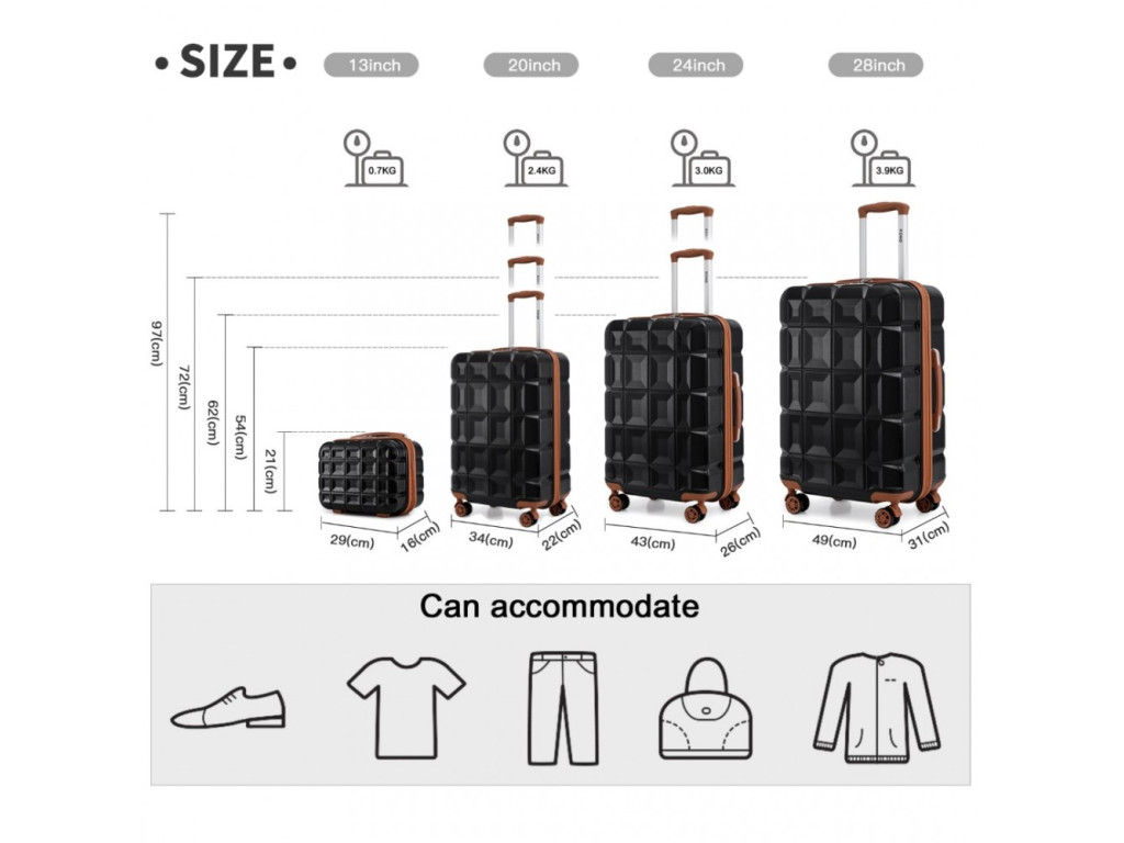 Sada obsahuje 4 kufre rozmerov XS, S, M a L pre cestovanie s rôznymi potrebami a dĺžkami. Kufrík XS -príručný kozmetický, kabínový S kufor na víkendové alebo ľahšie týždenné cesty. Stredný M kufor na týždenné cesty a L kufor aj na dvojtýždenné dovolenky.