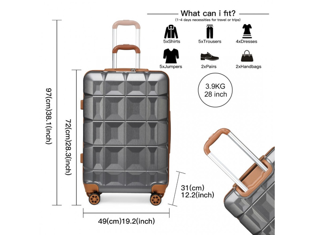 Je vyrobený z ABS, s tichými dvojitými kolieskami, hliníkovou výsuvnou rukoväťou alebo TSA číselným zámkom. ABS materiál ponúka odolnosť proti poškriabaniu a je vhodný do nízkych teplôt. Nie je síce natoľko pružný ako polypropylén, ale pre občasné cesty je celkom postačujúci.