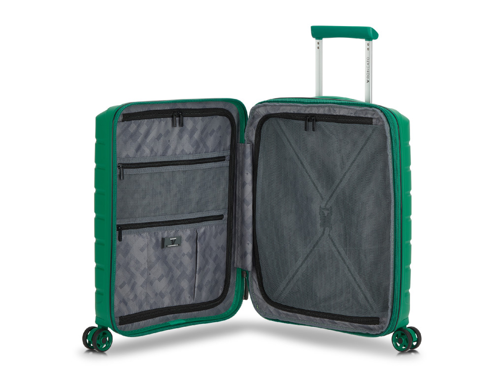 Kufre sú vyrobené zo 100% polypropylénu, čo zaručuje vysokú odolnosť proti nárazom a poškriabaniu. Aj keď je tento materiál extrémne pevný, je tiež veľmi ľahký. Vo vnútri kufra Roncato B-Flying nájdete premyslene rozvrhnuté priestory, disponujúce dvoma veľkými priehradkami na zips,ktoré vám umožnia oddeliť rôzne typy oblečenia či osobné predmety.