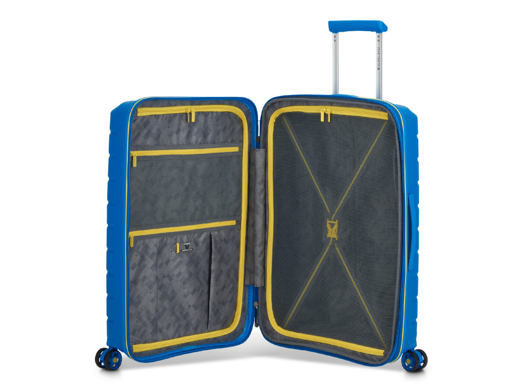 Kufre sú vyrobené zo 100% polypropylénu, čo zaručuje vysokú odolnosť proti nárazom a poškriabaniu. Aj keď je tento materiál extrémne pevný, je tiež veľmi ľahký. Vo vnútri kufra Roncato B-Flying nájdete premyslene rozvrhnuté priestory, disponujúce dvoma veľkými priehradkami na zips,ktoré vám umožnia oddeliť rôzne typy oblečenia či osobné predmety.