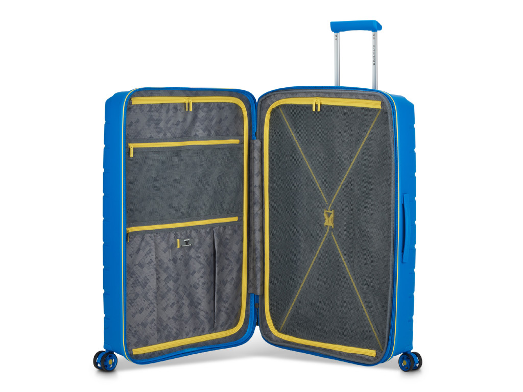 Kufre sú vyrobené zo 100% polypropylénu, čo zaručuje vysokú odolnosť proti nárazom a poškriabaniu. Aj keď je tento materiál extrémne pevný, je tiež veľmi ľahký. Vo vnútri kufra Roncato B-Flying nájdete premyslene rozvrhnuté priestory, disponujúce dvoma veľkými priehradkami na zips,ktoré vám umožnia oddeliť rôzne typy oblečenia či osobné predmety.