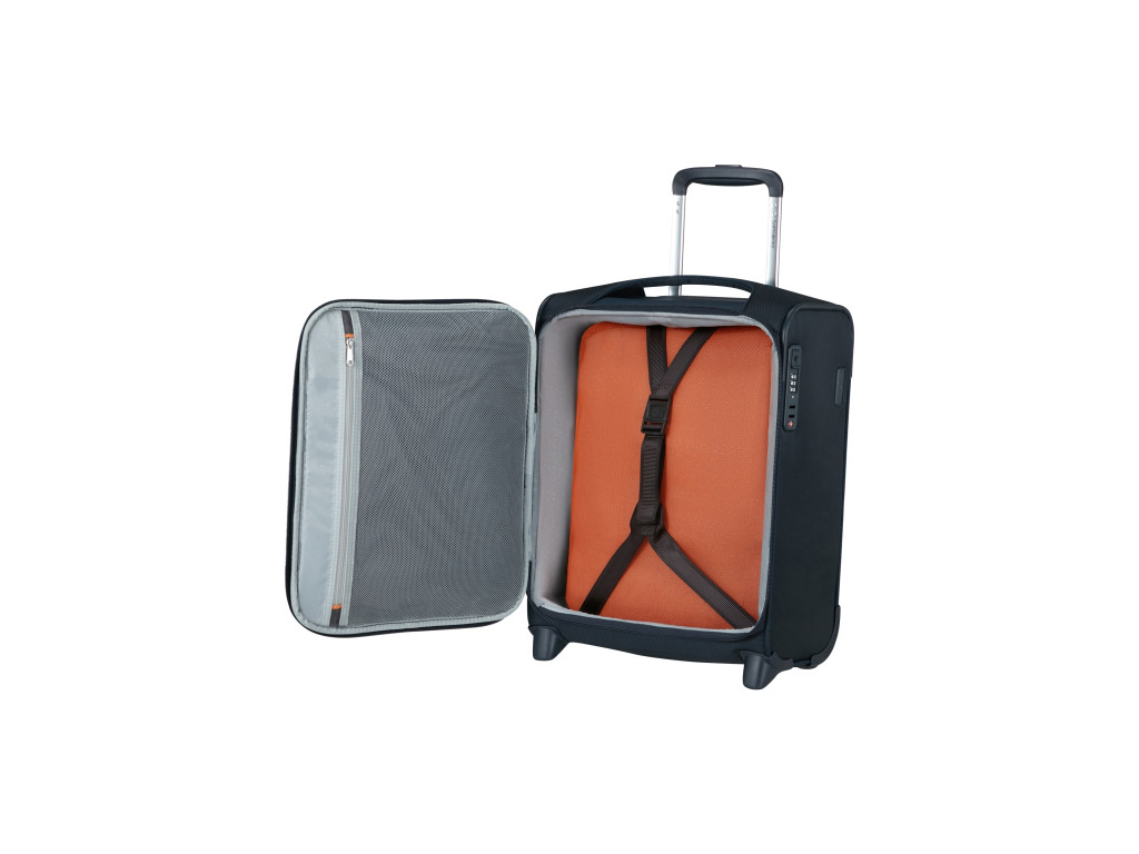 Vďaka kompaktným rozmerom je ideálny na umiestnenie pod sedadlo pred vami, čo zabezpečuje jednoduchý prístup k vašim veciam počas letu. Kufor je vyrobený z kvalitného polyesteru s využitím recyklovaných materiálov, čo prispieva k ochrane životného prostredia. Jeho elegantný dizajn dopĺňajú praktické funkcie, ako sú dve kolieska s integrovaným systémom pre hladký pohyb a výsuvná dvojitá trolej.