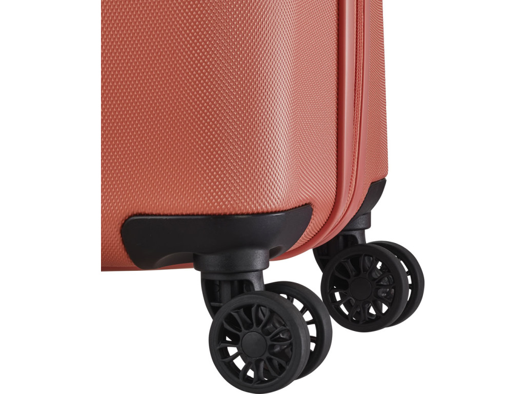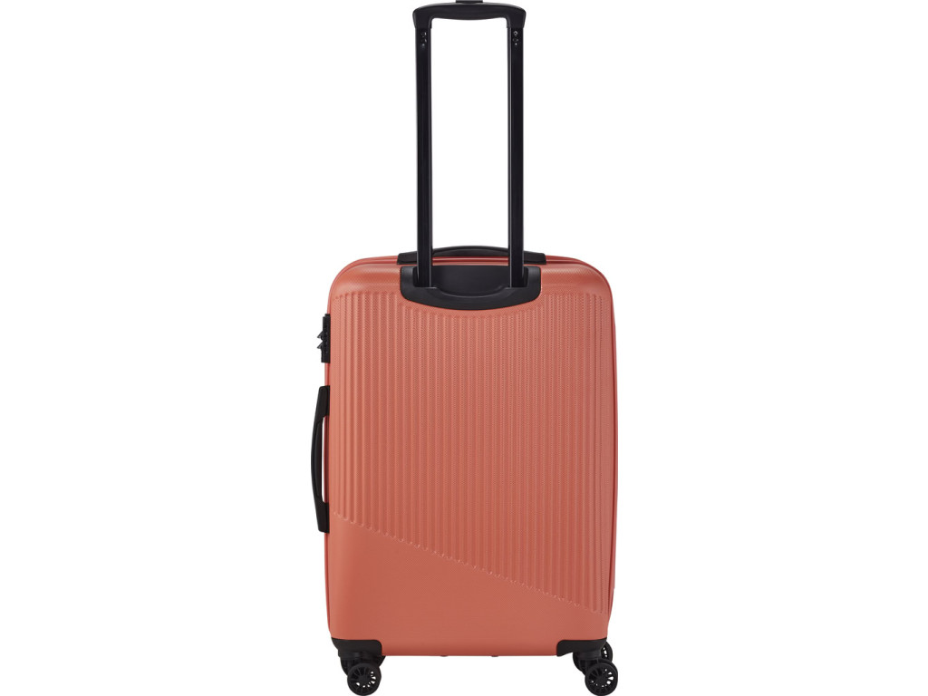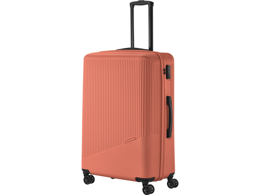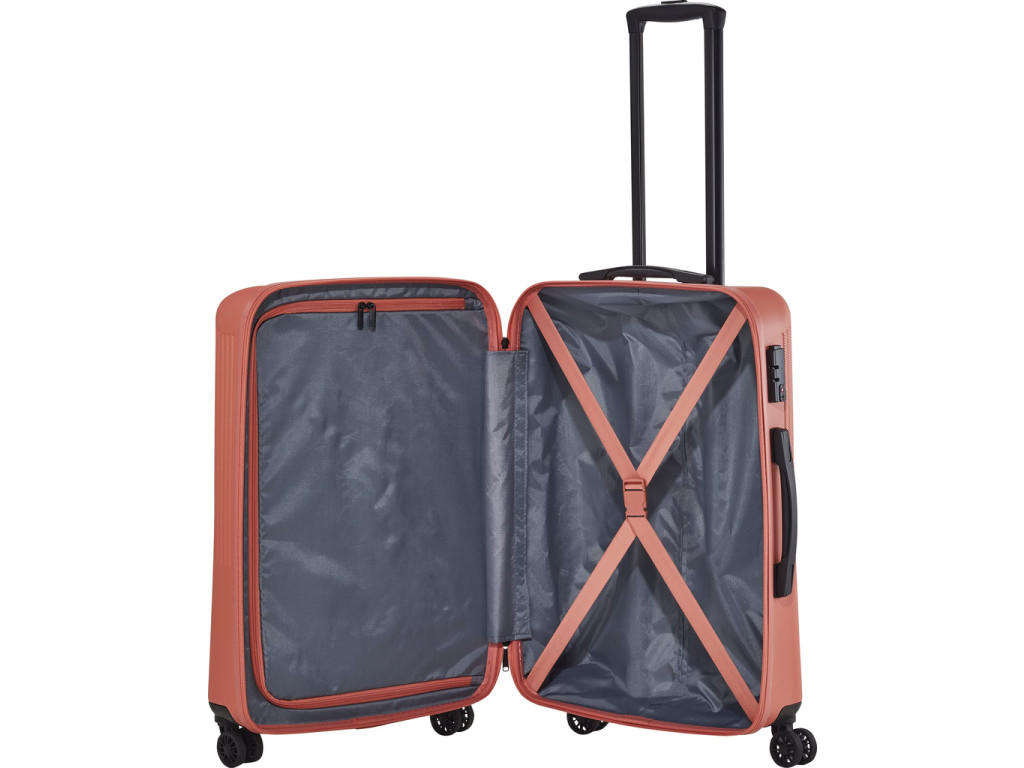 Jednoducho navrhnutý interiér s látkovou priečkou a popruhmi pomôže rýchlo a prehľadne zbaliť všetko potrebné na dlhšie cesty aj kratší pobyt mimo domova. Škrupina z odolného tvrdého plastu s hrubým povrchom a integrovaný zámok ochráni uložené veci počas prepravy. Štyri kolieska uľahčia jazdu v teréne aj manipuláciu s plne naloženou batožinou.