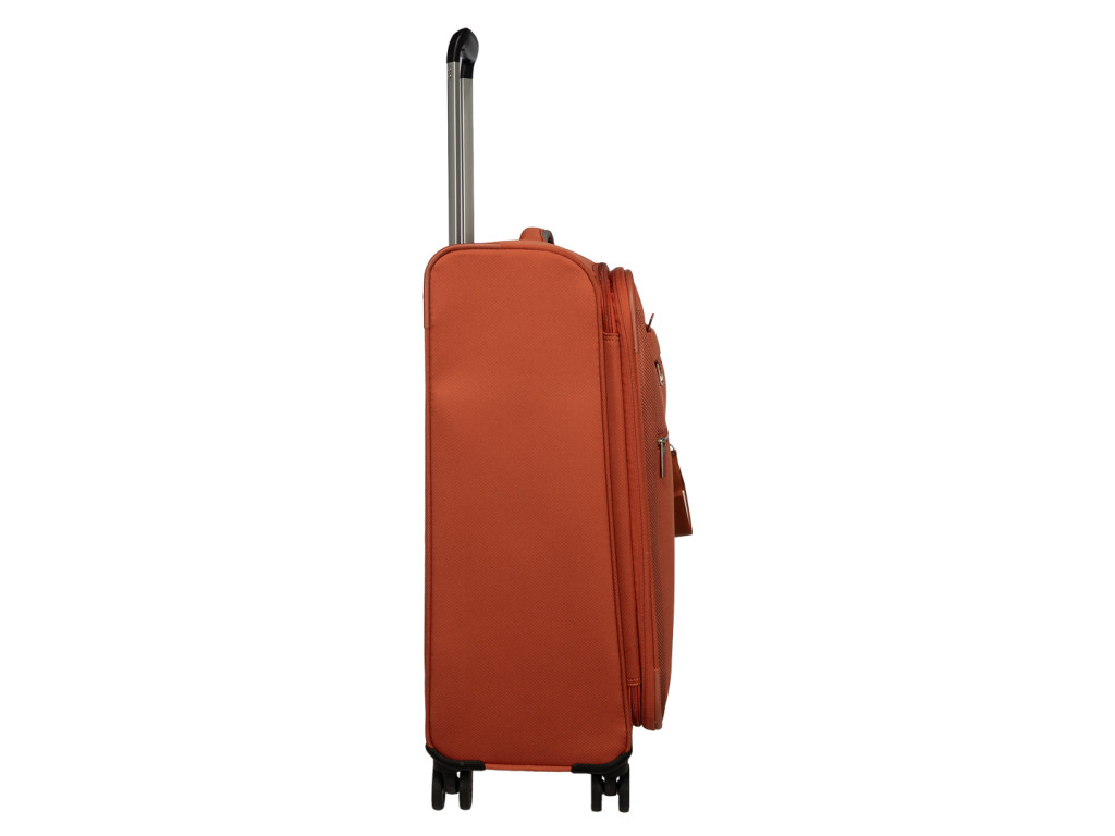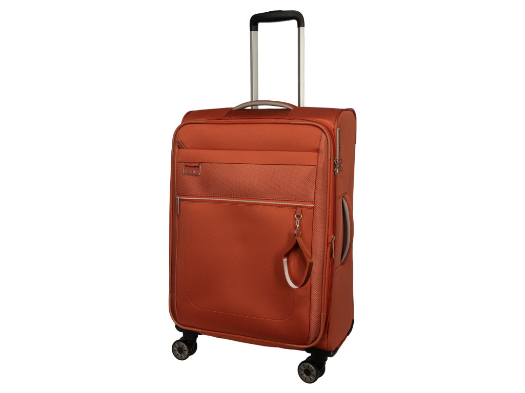 Elegantný štvorkolieskový textilný kufor s integrovaným TSA zámkom a expandérom, vyrobený z recyklovaného polyesteru.