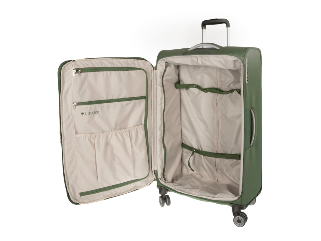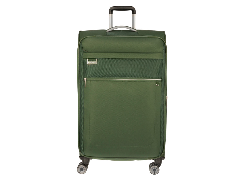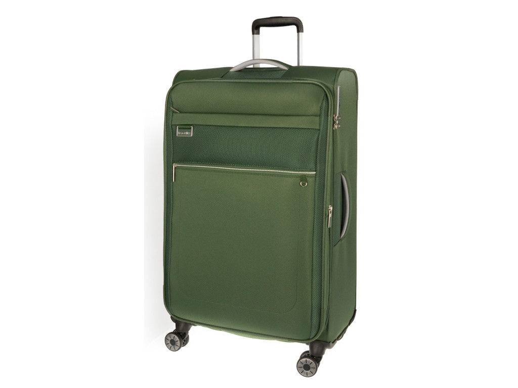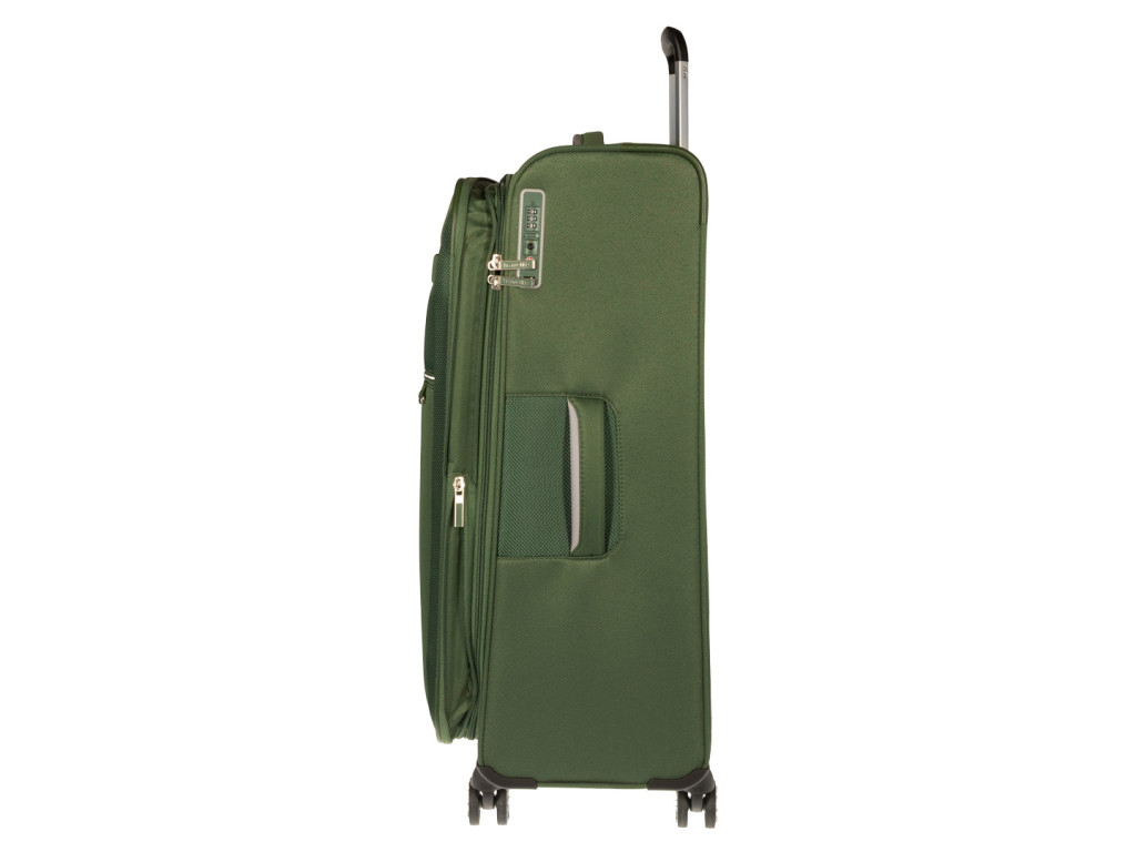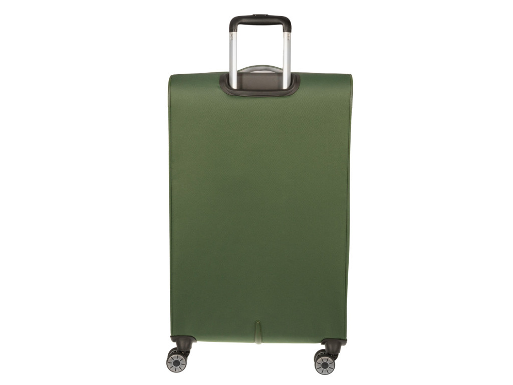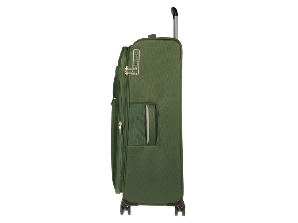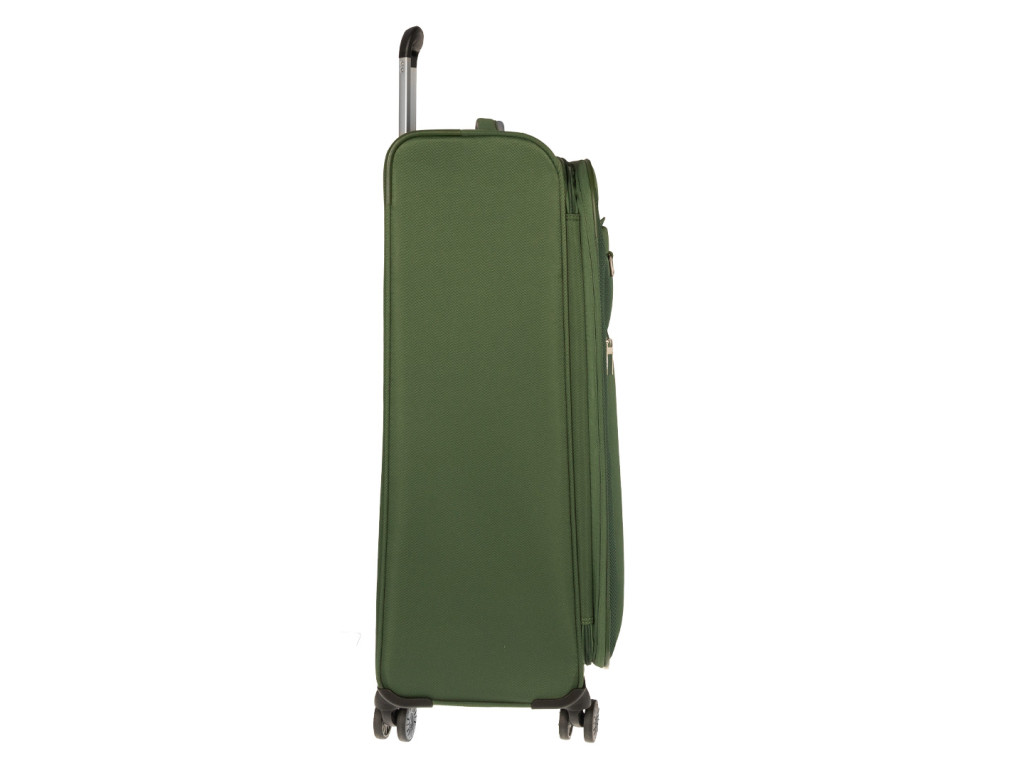 Elegantný štvorkolieskový textilný kufor s integrovaným TSA zámkom a expandérom, vyrobený z recyklovaného polyesteru.