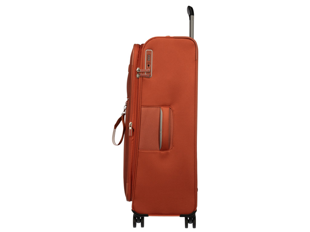 Elegantný štvorkolieskový textilný kufor s integrovaným TSA zámkom a expandérom, vyrobený z recyklovaného polyesteru.