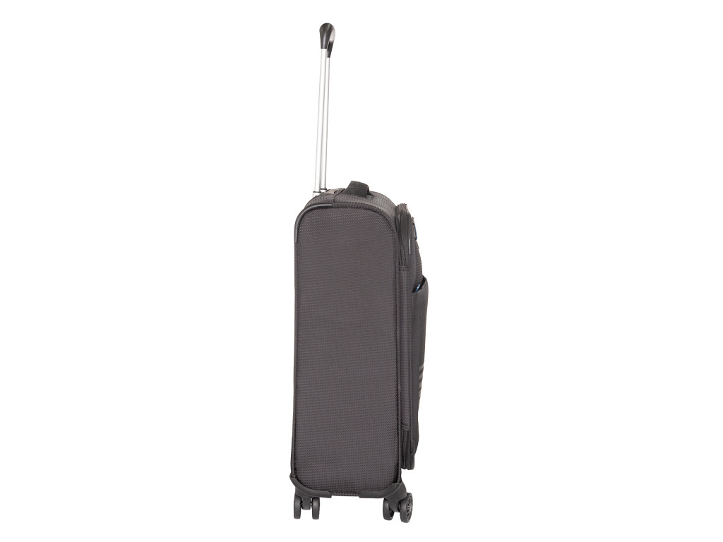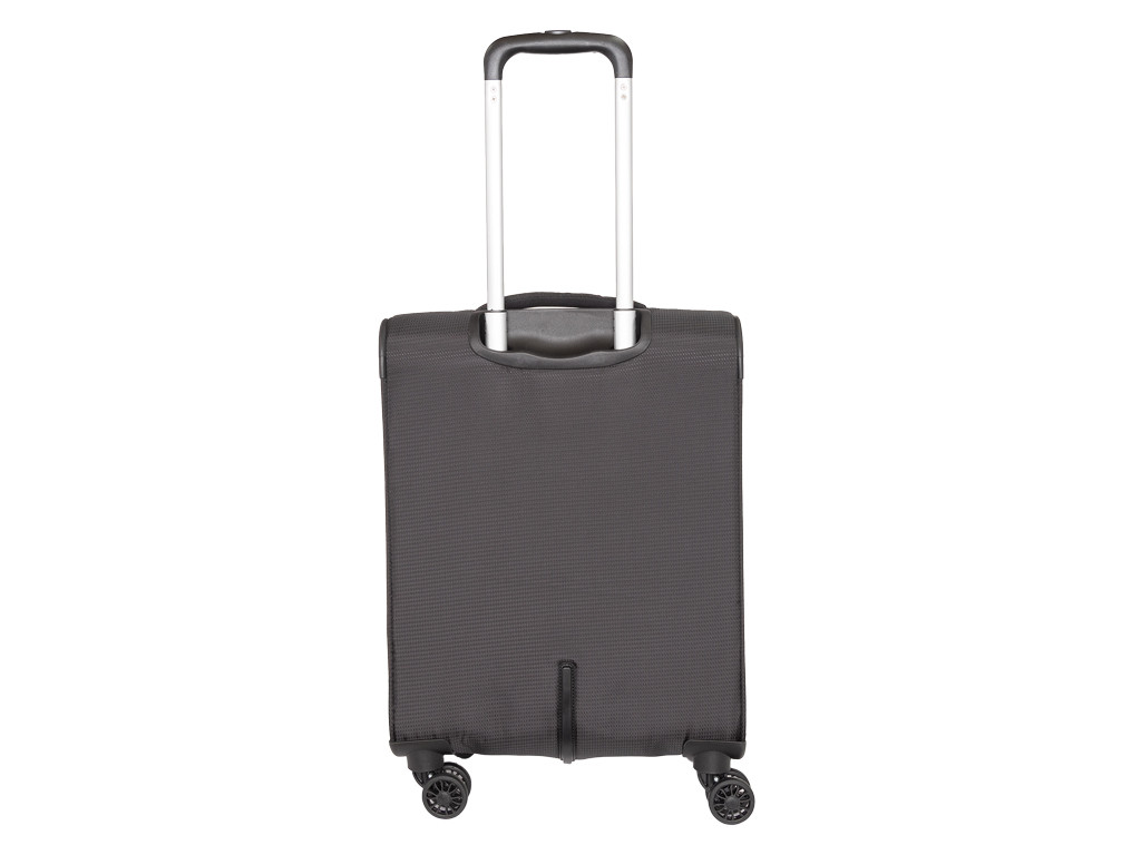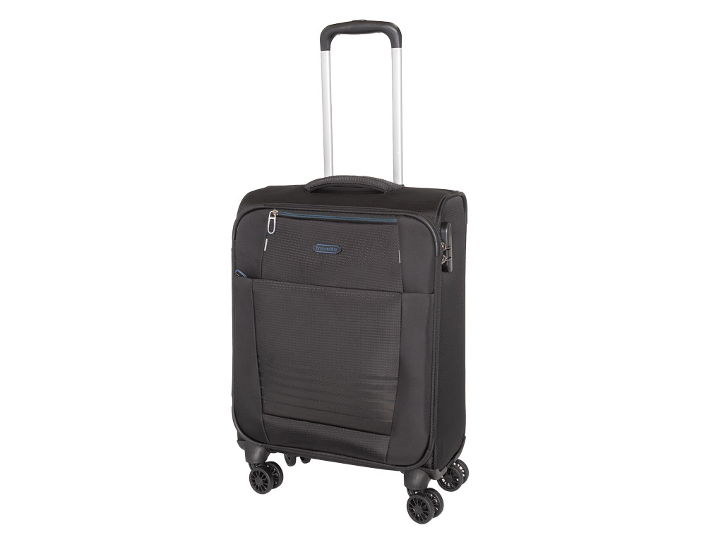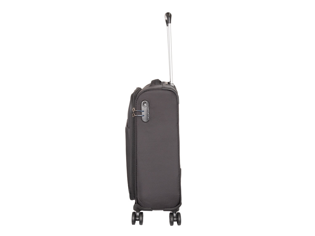 Odľahčený textilný cestovný kufor z odolného polyesteru na štyroch kolieskach, vybavený integrovaným TSA zámkom a expandérom.