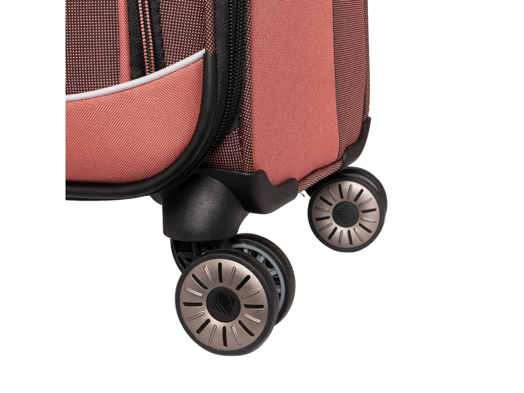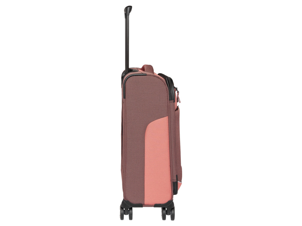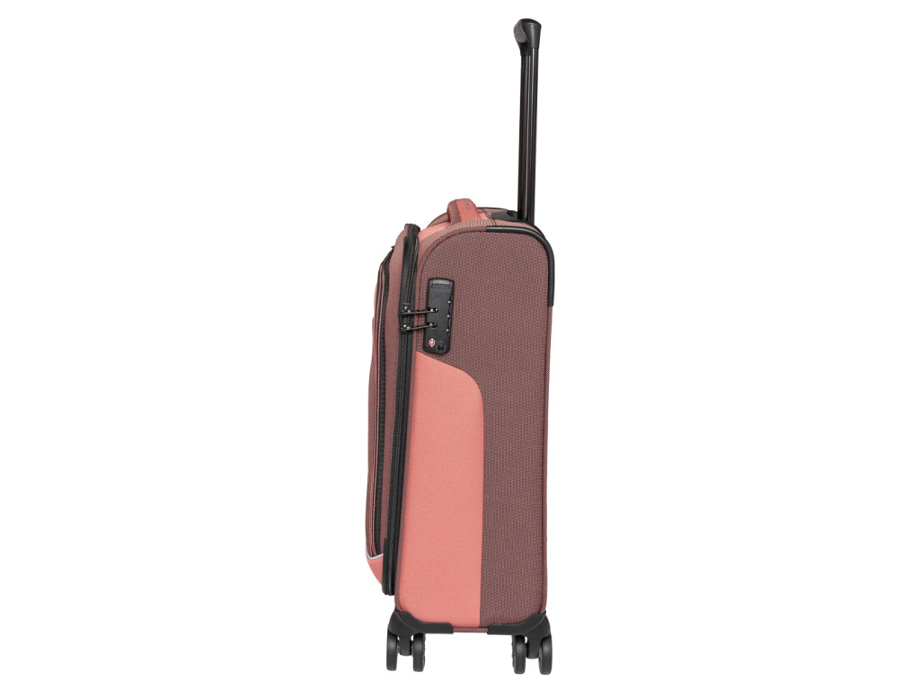 Textilný kufor na čtyroch kolieskach s integrovaným TSA zámkom a expandérom, vyrobený z recyklovaného polyesteru.