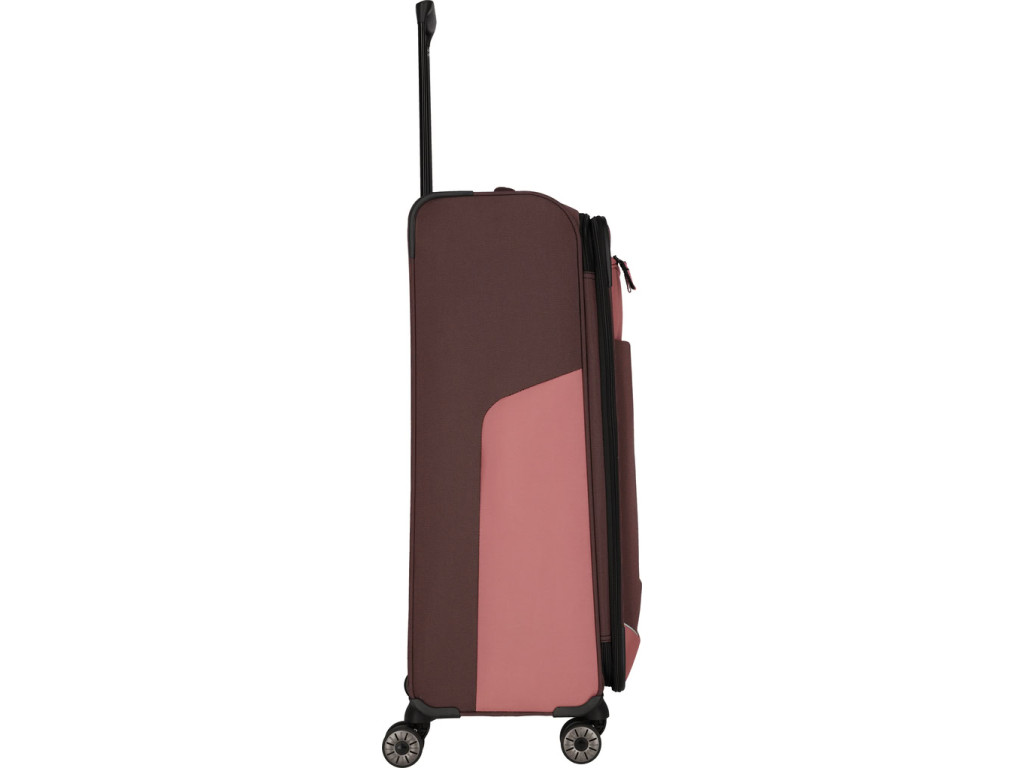 Textilný kufor na čtyroch kolieskach s integrovaným TSA zámkom a expandérom, vyrobený z recyklovaného polyesteru.